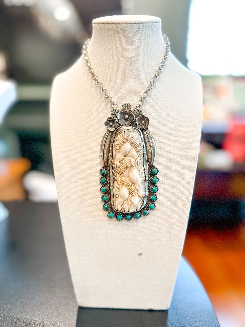 This one-of-a-kind, showstopper, silver-plated chain necklace is so unique! Made from genuine Indian silver, turquoise & a bone horse pendant. The chain is 36" long to make it adjustable to many various lengths.