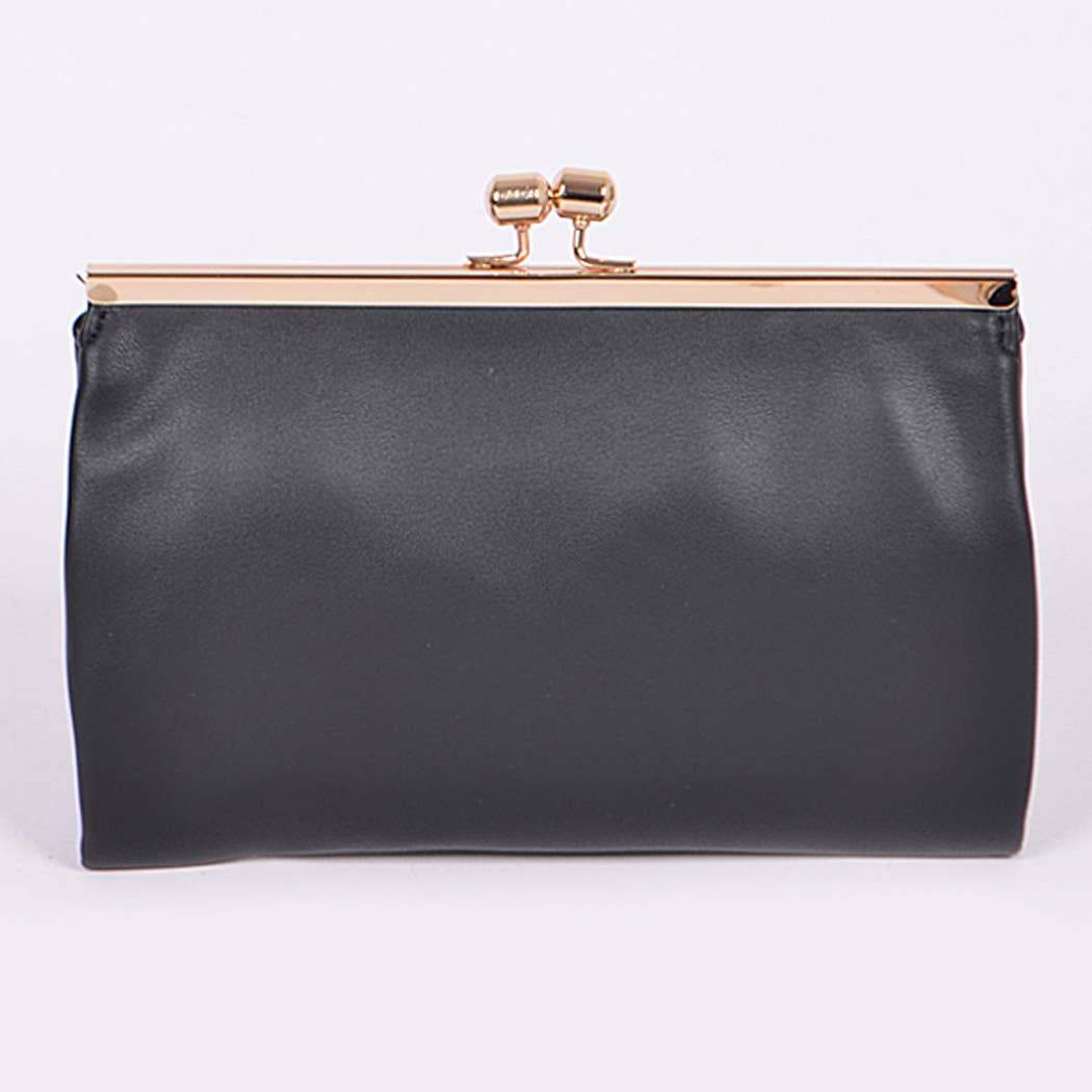 Elevate your outfit with our Black Clutch featuring a chic gold metal closure. Perfect for adding a touch of sophistication to any outfit, this sleek accessory is a must-have for your collection. Carry as a clutch or use as a cross body with the attached gold chain.