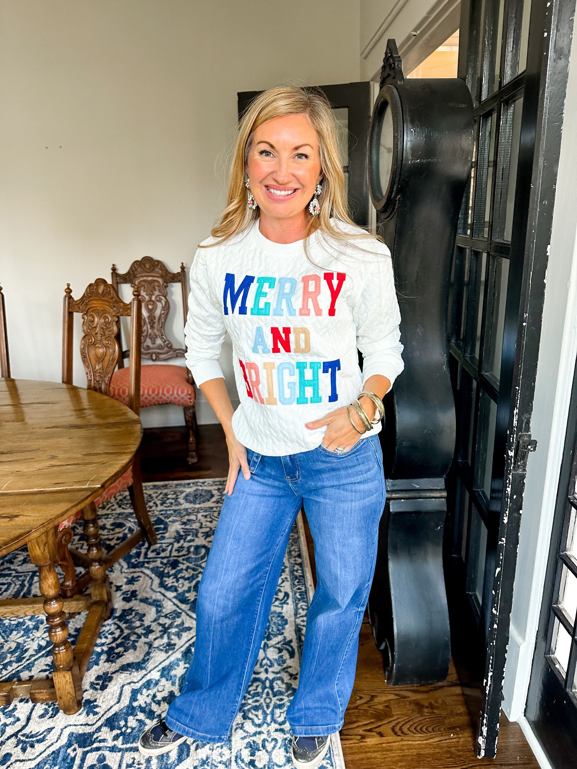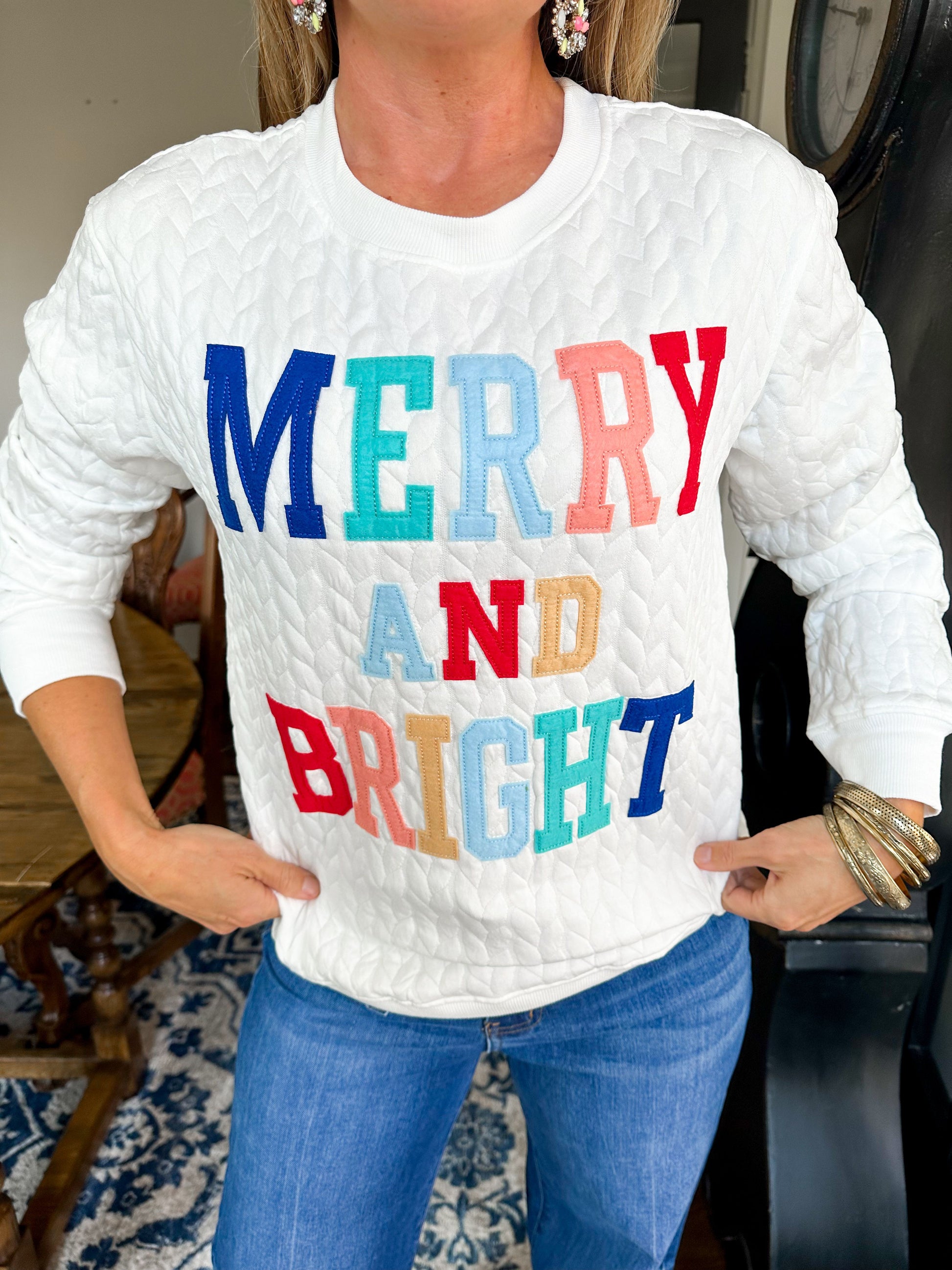 Introducing the Merry & Bright Quilted Sweatshirt, featuring a quilted design that'll keep you cozy and stylish all winter long. Let its festive vibes bring a little cheer to your wardrobe!