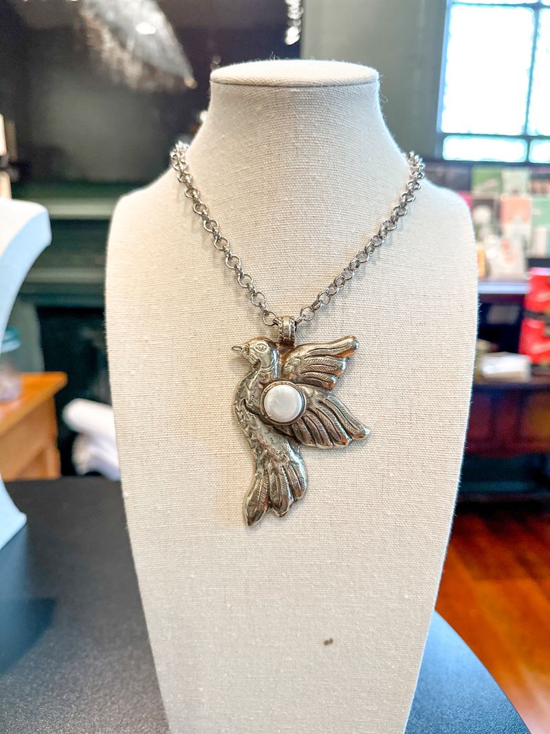 36" adjustable silver plated chain necklace with Indian silver bird with mother of pearl