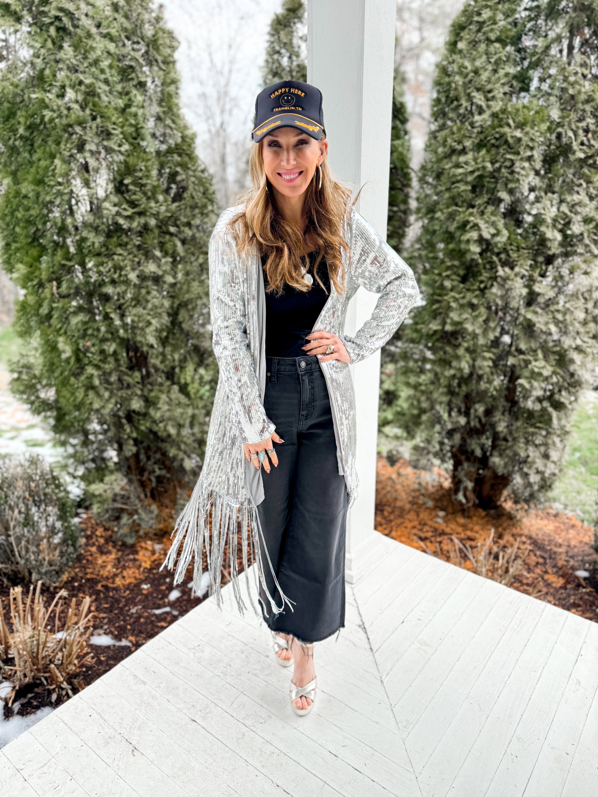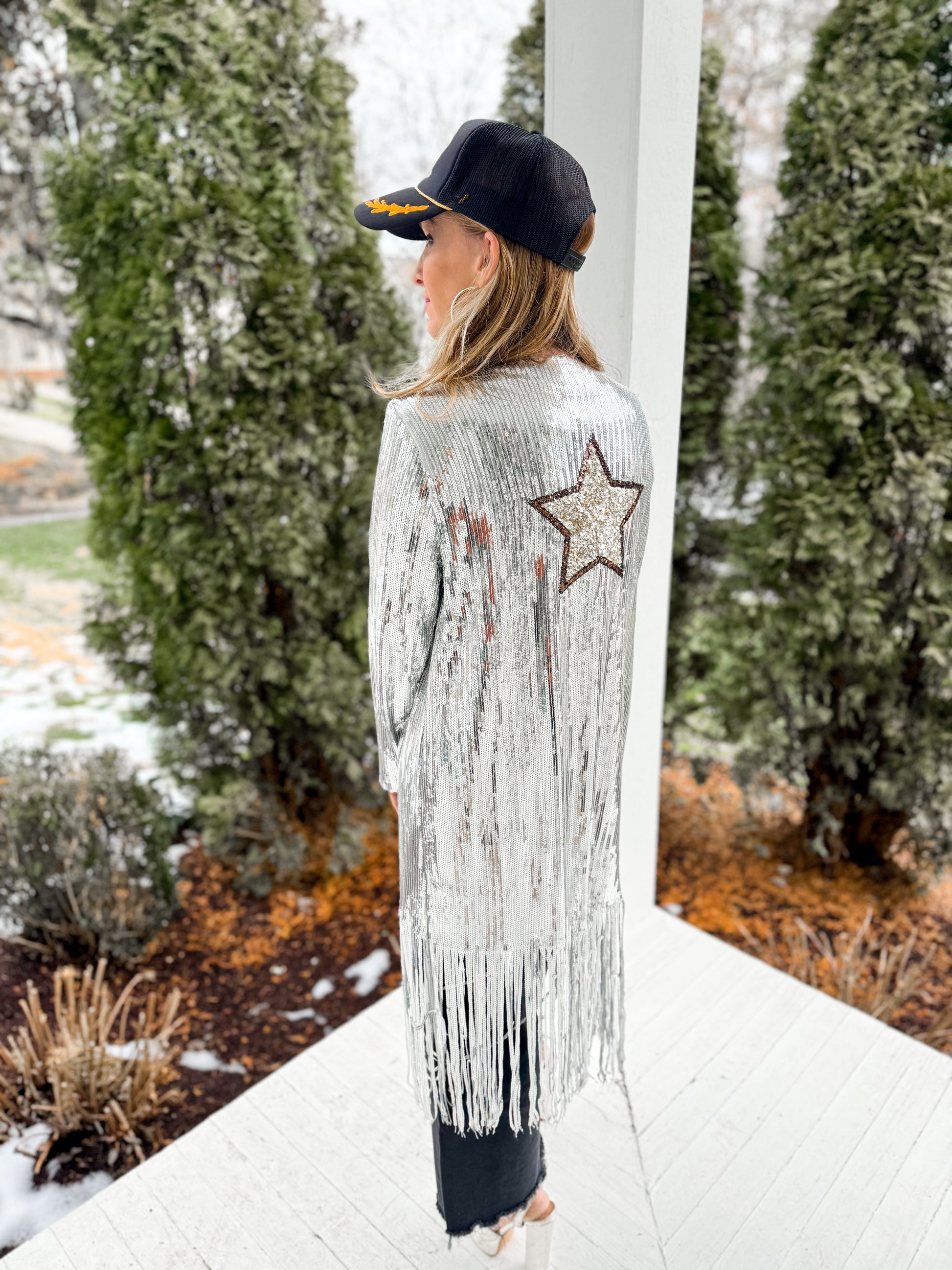 Make a shimmering statement with our Sequin Fringe Star Back Duster. This show-stopping piece features sequin embellishments and fringe details and a star pattern on the back. Elevate your style with this glamorous duster that adds a touch of sparkle to any ensemble.