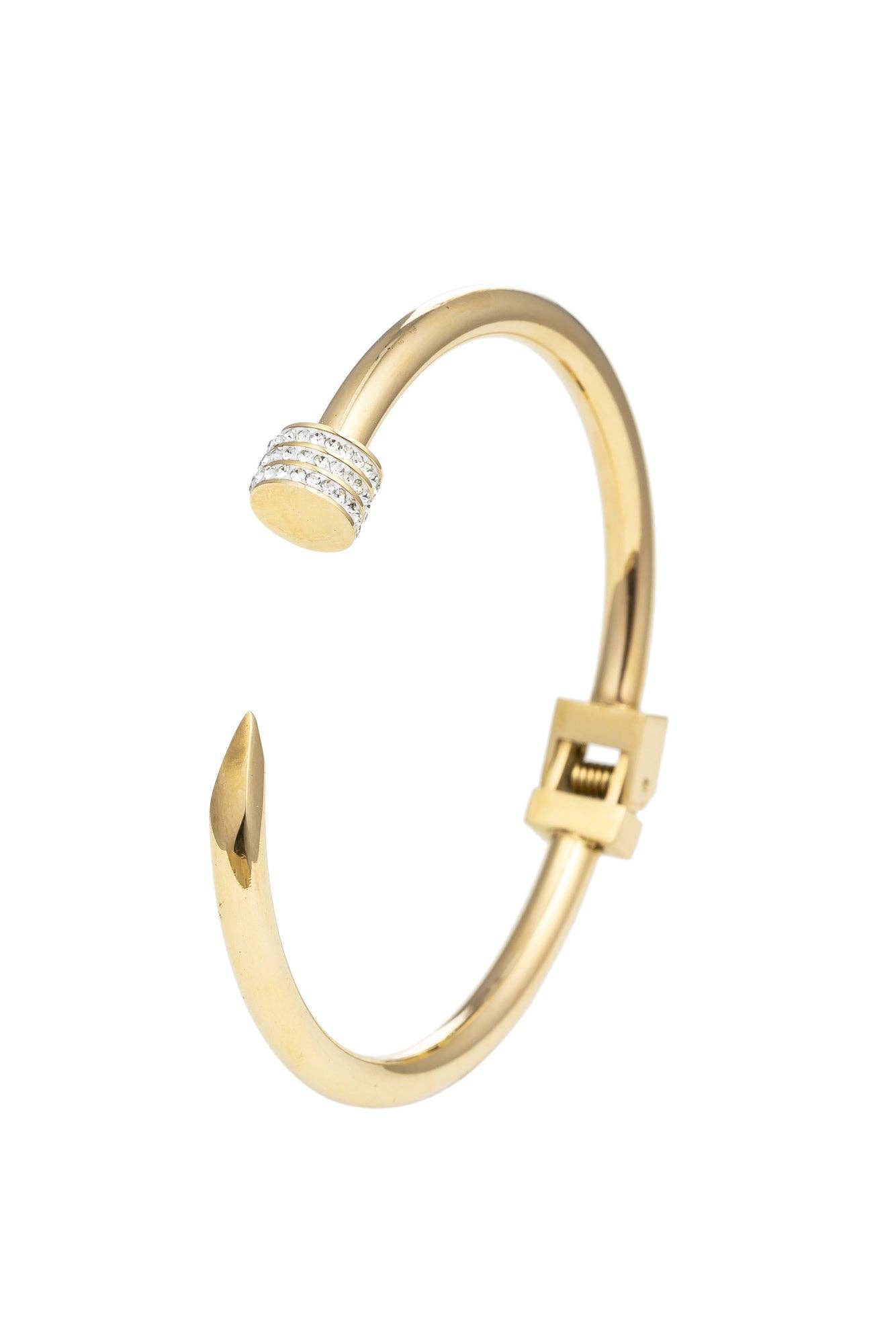 Spice up any outfit with this glowing cuff bracelet! A symbiotic relationship between the gold titanium and cubic zirconia that envelope this gold bracelet is what gives this piece of jewelry its glamorous appeal. Pair this cuff bracelet with a CZ crystal gold ring to complete the jewelry set!