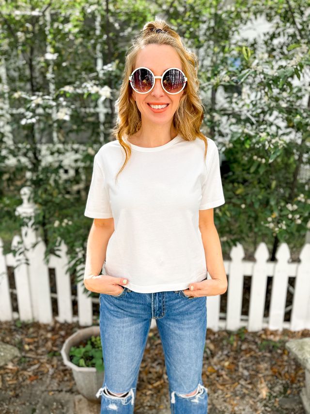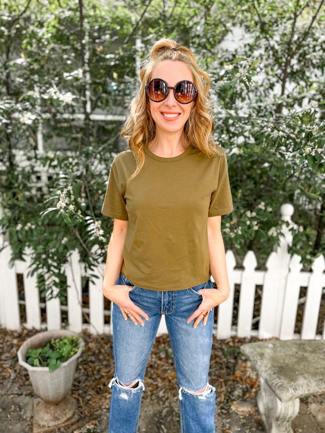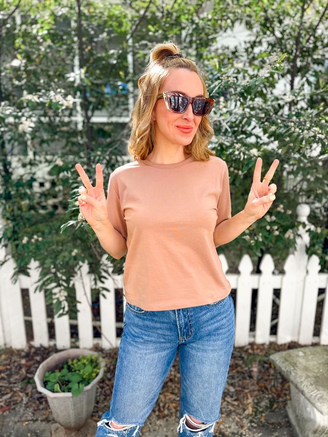 The best selling "Mom Crop" - a boxy tee designed to hit at the right place, making it a stylish and casual top for women of all ages. Rock it as a front tuck or, for those with a longer torso, let it hit right at the top of your mom jeans.