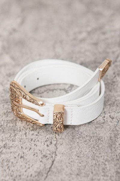 Classic leather belt designed with western-inspired details on belt and buckle. Features a round metal buckle and matching metal tip in an etched style.